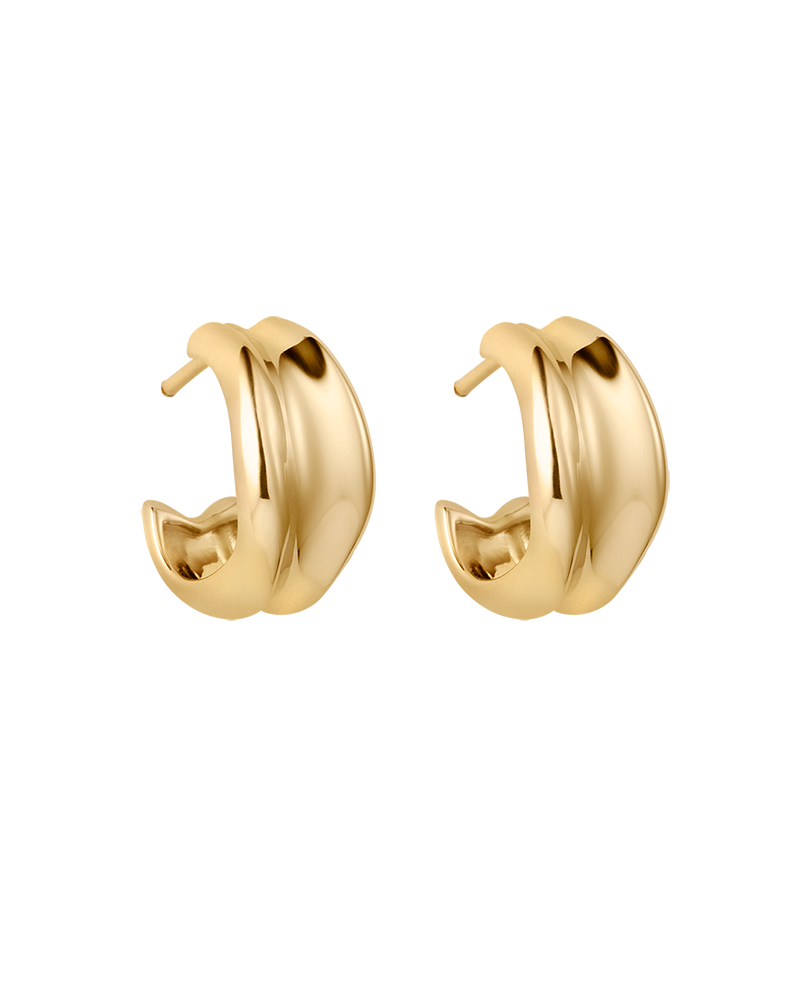 The sculptural appeal of the Presence Hoops makes them an ideal choice for those who appreciate boldness without excess. Their layered form commands attention while still maintaining a sense of elegance. Every curve has been carefully designed to create a dynamic shape that stands out yet remains timeless in style. What makes them especially appealing is the way they strike a balance between strength and minimalism. Whether paired with a sleek black dress for an evening out or a crisp white shirt during the day these earrings effortlessly enhance every outfit. They are crafted for women who see beauty in refined simplicity and who want their jewelry to embody quiet confidence. Their strong silhouette ensures they never fade into the background. Instead they frame the face beautifully and reflect light in a way that naturally draws the eye.